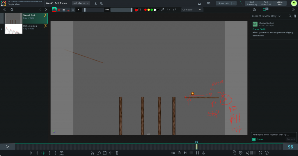 In this week’s, George gave me feedback on my bouncing ball animation. He suggested that in the planning stage I should add two more frames at the first two peaks, so the ball slows down more naturally. He also pointed out that the ball was rotating in the wrong direction. At the end of the animation, the ball should stop instead of falling down. Finally, between frame 90 and 98, the ball jumped too far, and I need to adjust the spacing. This feedback helps me to improve my timing and planning for the next practice.